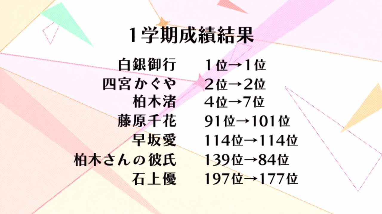 期末テストが迫った生徒会室では、いつも以上のプレッシャーの中で、かぐやと白銀の心理戦が繰り広げられていた。白銀に勉学では勝てないことにプライドを傷つけられた万能型の天才・かぐや。生徒会長として学年トップの座を誰にも譲るわけにはいかない努力型の天才・白銀。二人は相手を出し抜くために嘘を付き合い、権謀術数をめぐらせていく……。ついに訪れた期末テスト当日。勝利の女神は一体どちらに微笑むのか!?