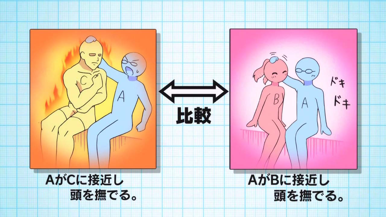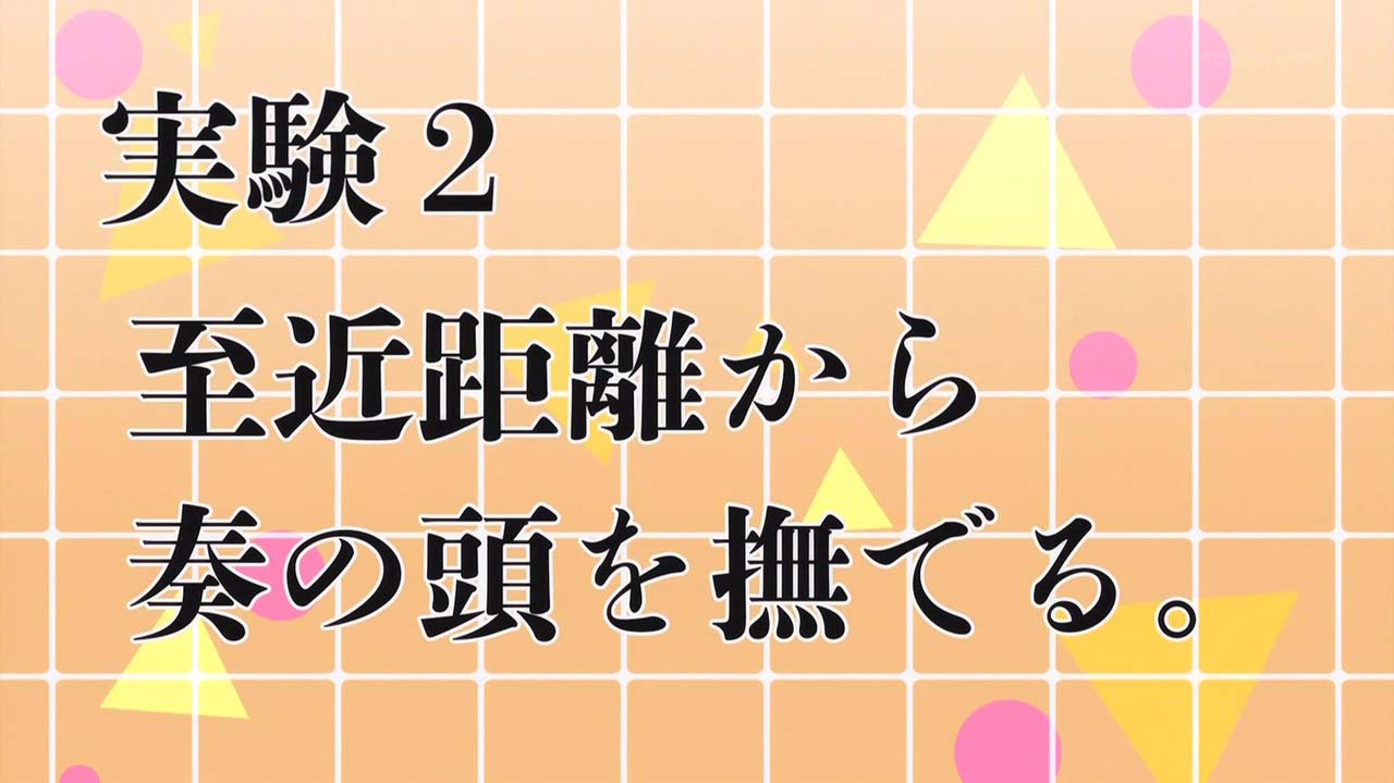 相手のことを「好き」かどうか証明するため、至近距離から氷室の頭を撫でながら、心拍数を計測する雪村。それを見ていた同じ池田研の先輩・棘田は、「対照実験」の必要性を説く。つまり、雪村がドキドキしているのは、相手が氷室だからなのか、それとも女なら誰でも興奮してしまうのかを証明するため、雪村は奏や棘田の頭も撫でることに…。一方、氷室は愛情を込めた料理の方がおいしいことを証明しようと調理をするが…。