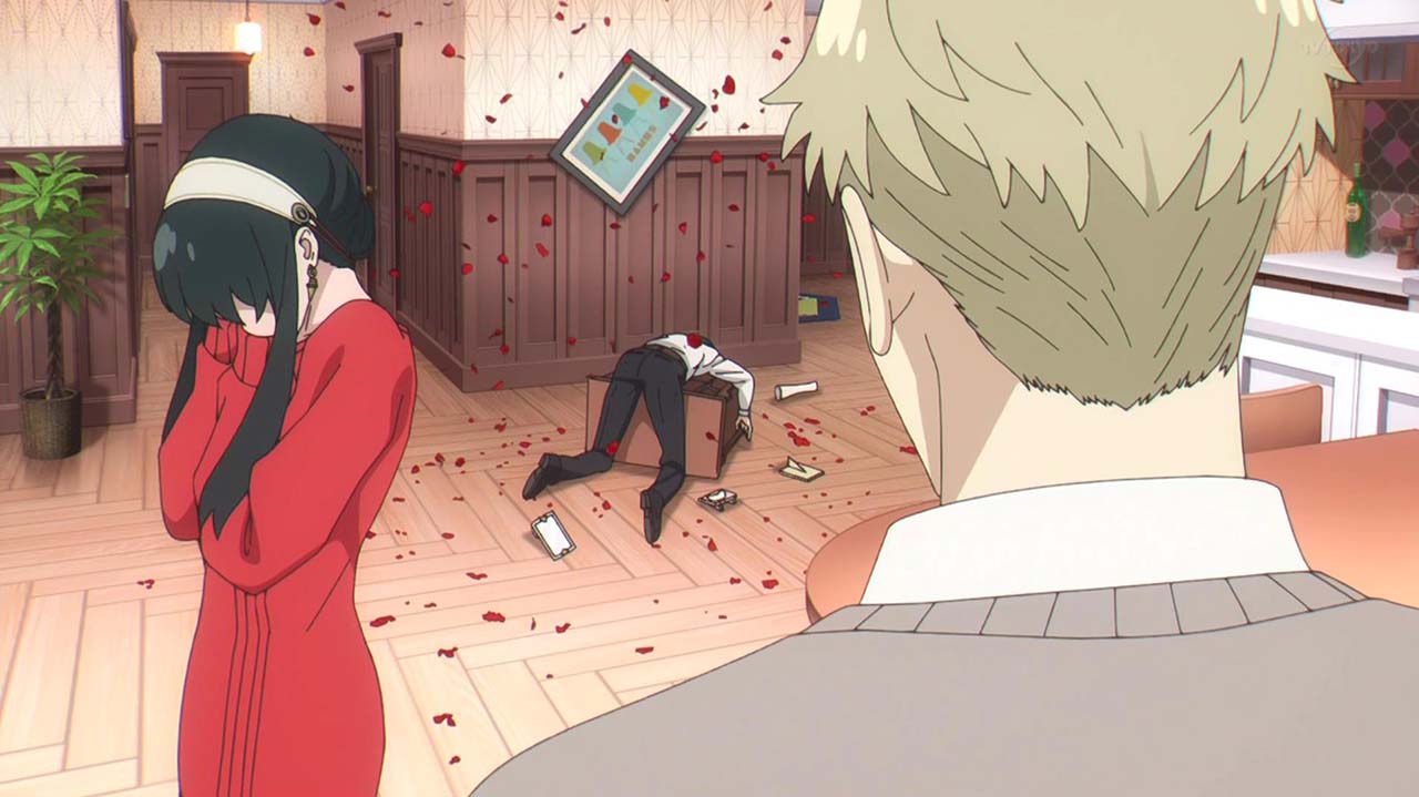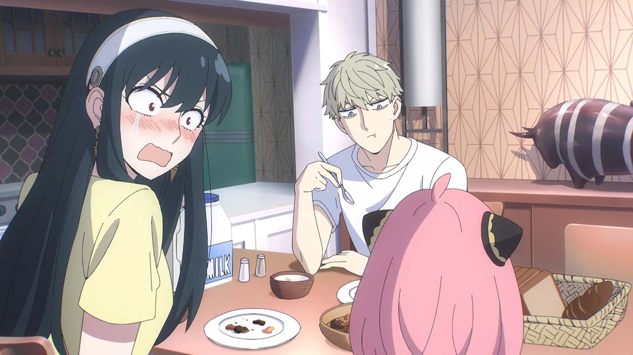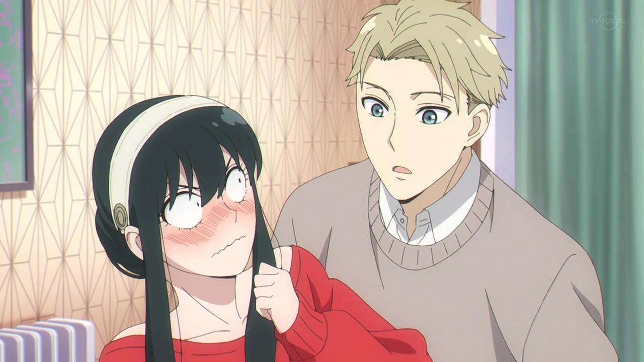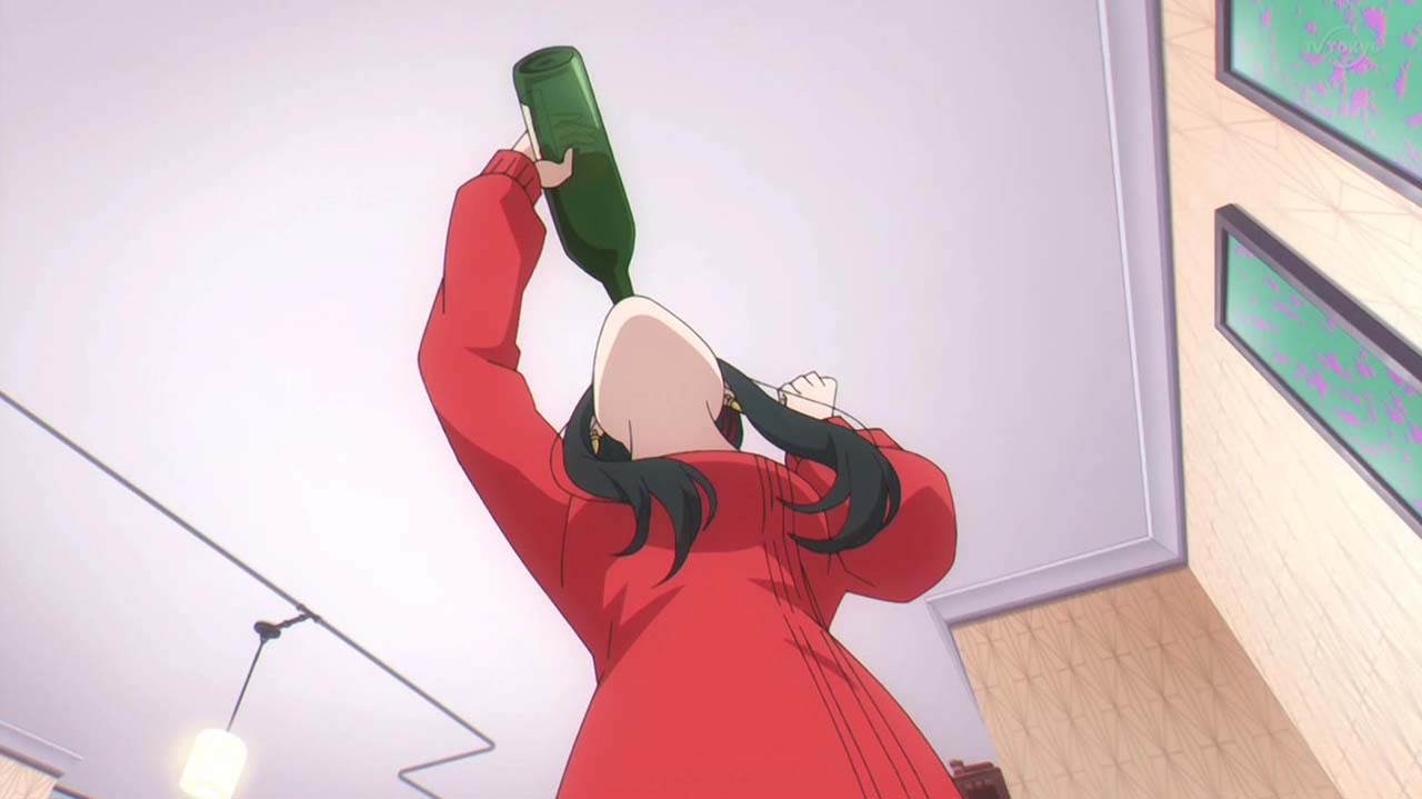 ユーリに偽装夫婦と怪しまれたロイドたちは、本物の夫婦であることを証明するためにキスをすることに。オペレーション〈梟ストリクス〉のため即座に対応しようとするロイドとは逆に、とてもシラフではできないと、ワインをガブ飲みして泥酔するヨル。そんな姉を見るユーリも、同じく泥酔して正常な判断ができず……。