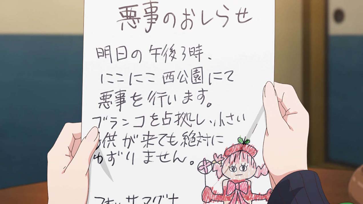 ベリーブロッサムに宛てて、初めての”犯行予告”を出したクロマ。しかし実施日は荒天で、当のクロマは家に引きこもってしまう。予告場所に様子を見に行った地図子は、負傷したベリーを発見。手当のため、自宅に連れ帰ることになり……